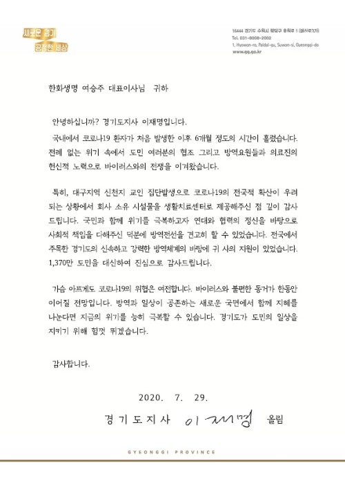 ÀÌÀç¸í °æ±âµµÁö»ç°¡ Äڷγª19 °æÁõȯÀÚ Ä¡·á¸¦ À§ÇØ °æ±âµµ°¡ ¿î¿µÇÑ »ýȰġ·á¼¾ÅÍ¿Í ÇØ¿ÜÀÔ±¹ µµ¹Î ÀӽûýȰ½Ã¼³¿¡ µµ¿òÀ» ÁØ ¹Î°£±â¾÷ ¹× ÀÇ·á±â°ü µî 12°÷¿¡ °¨»ç ÆíÁö¸¦ Àü´ÞÇß´Ù.