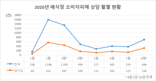 ¿ùº° »ó´ãÃßÀ̸¦ º¸¸é 1¿ù¿¡´Â 60°ÇÀÌ´ø °áÈ¥½ÄÀå °ü·Ã »ó´ãÀÌ Äڷγª°¡ È®»êµÇ´ø 2¿ù 563°Ç, 3¿ù 447°ÇÀ¸·Î Áõ°¡Çß´Ù°¡ 4¿ù ÀÌÈÄ 150°Ç ÀüÈÄ·Î °¨¼ÒÇß´Ù. ±×·¯³ª ¼öµµ±ÇÀ» Áß½ÉÀ¸·Î Äڷγª19°¡ ÀçÈ®»êµÇ¸é¼ 8¿ù¿¡¸¸ 20ÀϱîÁö 318°ÇÀÇ »ó´ãÀÌ Á¢¼öµÇ´Â µî Å«ÆøÀÇ Áõ°¡¼¼¸¦ º¸À̰í ÀÖ´Ù.