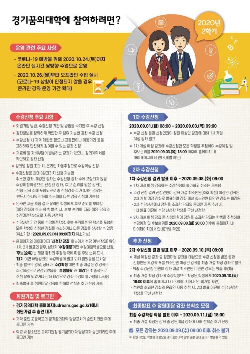 ƯÈ÷, À̹ø 2Çб⠿Àº Äڷγª19 ¹ÙÀÌ·¯½º Áý´Ü °¨¿° ¿¹¹æÀ» À§ÇØ ÈÞ° ±â°£À» Æ÷ÇÔÇØ 10¿ù 24ÀϱîÁö´Â ½Ö¹æÇ⠿¶óÀÎ ¼ö¾÷À¸·Î ÇÑ´Ù. ±× ÀÌÈĺÎÅÍ´Â ¿ÀÇÁ¶óÀÎ ¼ö¾÷À» ÇÒ ¿¹Á¤ÀÌÁö¸¸, Äڷγª19 »óȲÀÌ ¾ÈÁ¤µÇÁö ¾ÊÀ¸¸é ¿Â¶óÀÎ ¼ö¾÷À» ¿¬ÀåÇÒ ¼ö ÀÖ´Ù.