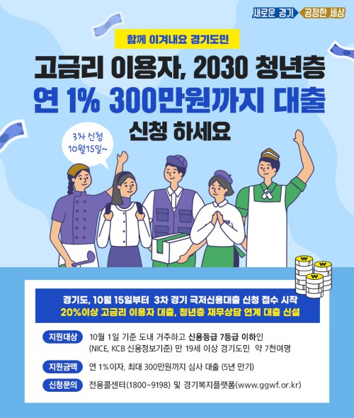3Â÷ ‘°æ±â ±ØÀú½Å¿ë´ëÃâ’ Áö¿ø´ë»óÀº ±âÁ¸°ú °°ÀÌ 10¿ù 1ÀϺÎÅÍ ½ÅûÀÏ ÇöÀç °æ±âµµ¿¡ °ÅÁÖÇϰí, ½Å¿ëµî±Þ(NICE, KCB ±âÁØ) 7µî±Þ ÀÌÇÏÀÎ ¸¸ 19¼¼ ÀÌ»óÀÇ µµ¹ÎÀÌ´Ù. ½Å¿ëµî±Þ°ú °æ±âµµ °ÅÁÖ ¿ä°Ç¸¸ ÃæÁ·ÇÏ¸é ¿¬ 1% ÀÌÀÚ, ½É»ç¸¦ °ÅÃÄ 300¸¸¿ø±îÁö ´ëÃâ °¡´ÉÇÏ´Ù.