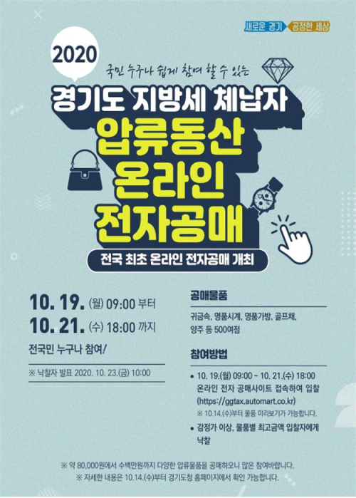 °æ±âµµ°¡ Áö¹æ¼¼ °í¾×ü³³ÀÚÀÇ ¼¼±Ý ¡¼ö¸¦ À§ÇØ ¾Ð·ùÇÑ ¸íǰ°¡¹æ°ú ½Ã°è, ±Í±Ý¼Ó µîÀ» 19ÀϺÎÅÍ ¿Â¶óÀÎÀ» ÅëÇØ °ø°³ ¸Å°¢ÇÑ´Ù. °æ±âµµ´Â Áö³ 2015³âºÎÅÍ °í¾×ü³³ÀÚµéÀÇ ¾Ð·ù ¹°Ç° °ø¸Å¸¦ ¿ÀÇÁ¶óÀÎÀ¸·Î ÁøÇàÇߴµ¥ ¿ÃÇØ´Â Äڷγª 19·Î ºñ´ë¸é ¿Â¶óÀÎ ÀüÀÚ °ø¸Å¸¦ ½Ç½ÃÇÏ°Ô µÆ´Ù°í ¼³¸íÇß´Ù.