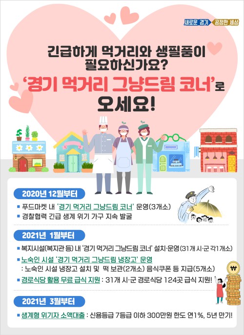 ³»³â 1¿ù¿¡´Â 31°³ ½Ã·±ºº°·Î Á¾ÇÕ, Àå¾ÖÀÎ, ³ëÀκ¹Áö°ü µî º¹Áö½Ã¼³ Áß 1°÷¾¿À» ¼±Á¤ÇØ ‘°æ±â ¸Ô°Å¸® ±×³Éµå¸² Äڳʒ¸¦ ¼³Ä¡·¿î¿µÇÑ´Ù. ±ä±Þ »ý°èÀ§±â ´ë»óÀÚ µî »ýȰ¿¡ ¾î·Á¿òÀ» °Þ°í ÀÖ´Â »ç¶÷Àº ´©±¸³ª À̰÷¿¡¼ ¹«·á·Î ¸Ô°Å¸®¿Í »ýȰ¿ëǰÀ» ÀÌ¿ëÇÒ ¼ö ÀÖ´Ù.