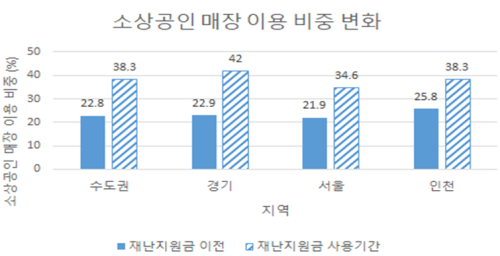 Àç³Áö¿ø±ÝÀº ¼Ò»ó°øÀÎ ¸ÅÀå ¼Òºñ ÃËÁø È¿°úµµ °¡Á®¿Ô´Ù. Àç³Áö¿ø±Ý ¼ö·É ÀÌÀü¿¡´Â ¼Ò»ó°øÀÎ ¸ÅÀå ÀÌ¿ë ºñÀ²ÀÌ 22.8%¿´´øµ¥ ¹ÝÇØ Àç³Áö¿ø±Ý Áö±Þ ÀÌÈÄ¿¡´Â 15.5%p(1.7¹è) Áõ°¡ÇÑ 38.3%·Î ³ªÅ¸³µ´Ù. ƯÈ÷ °æ±âµµÀÇ °æ¿ì Áö±Þ Àü 22.9%¿¡¼ Áö±Þ ÈÄ 42.0%·Î, 19.1%p(1.8¹è)°¡ Áõ°¡Çß´Ù.