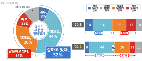 °æ±âµµ°¡ ºÎµ¿»êÁ¤Ã¥ ÃßÁøÀ» ÀßÇϰí ÀֳĴ ¹°À½¿¡´Â µµ¹ÎÀÇ 52%°¡ ‘ÀßÇϰí ÀÖ´Ù’°í Æò°¡Çß´Ù. ÀÌ´Â Áö³ÇØ 8¿ù Á¶»ç°á°úº¸´Ù 4%p Áõ°¡ÇÑ ¼öÄ¡´Ù. ‘À߸øÇϰí ÀÖ´Ù’´Â 37%¿´´Ù.