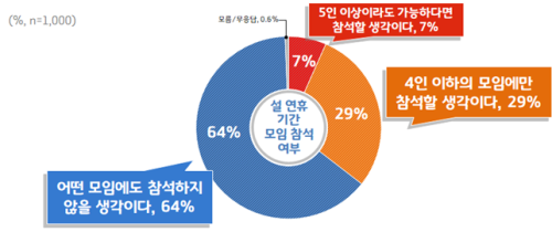 ¼³ ¿¬ÈÞ ±â°£ °¡Á·, Ä£Áö, Ä£±¸ µî°úÀÇ ¸ðÀÓ ¾à¼Ó¿¡ ´ëÇØ¼´Â µµ¹ÎÀÇ 64%°¡ ‘¾î¶² ¸ðÀÓ¿¡µµ Âü¼®ÇÏÁö ¾ÊÀ» »ý°¢’À̶ó°í ´äÇß°í, ‘4ÀÎ ÀÌÇÏÀÇ °æ¿ì¿¡¸¸ Âü¼®ÇÒ »ý°¢’Àº 29%·Î ³ªÅ¸³ª, µµ¹ÎµéÀÌ ‘5ÀÎ ÀÌ»ó »çÀû¸ðÀÓ ±ÝÁö’¸¦ Æ÷ÇÔÇÑ ¼³ ¿¬ÈÞ ¹æ¿ª´ëÃ¥À» ¼º½ÇÈ÷ Áöų °ÍÀ¸·Î ¿¹»óµÈ´Ù.