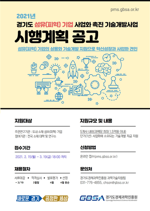 »ç¾÷¿¡ ´ëÇÑ ÀÚ¼¼ÇÑ »çÇ×Àº ÀÌÁöºñÁî(www.egbiz.or.kr) ¶Ç´Â °æ±âµµR&D°ü¸®½Ã½ºÅÛ(pms.gbsa.or.kr)ÀÇ °ø°í¹®À» ÂüÁ¶Çϰųª, °æ°ú¿ø °úÇбâ¼úÁö¿øÆÀ(031-776-4855)À¸·Î ¹®ÀÇÇÏ¸é ¾È³»¹ÞÀ» ¼ö ÀÖ´Ù.
