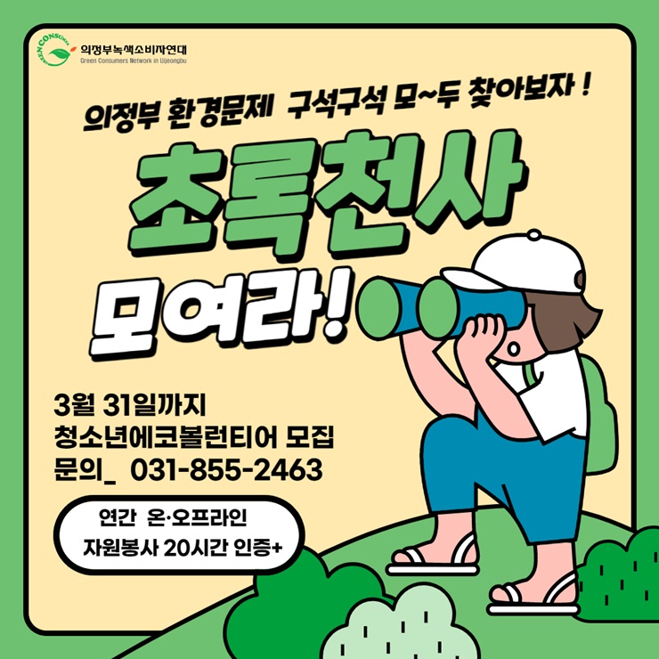 ÀÇÁ¤ºÎ³ì»ö¼ÒºñÀÚ¿¬´ë´Â 3¿ù 31ÀϱîÁö ÀÇÁ¤ºÎ¿¡¼ Ȱµ¿Çϴ û¼Ò³âÀ» ´ë»óÀ¸·Î û¼Ò³â ¿¡ÄÚº¼·±Æ¼¾î ‘ÃÊ·Ïõ»ç’ 6±â Âü°¡ÀÚ 150¸íÀ» ¼±Âø¼ø ¸ðÁýÇÑ´Ù.
