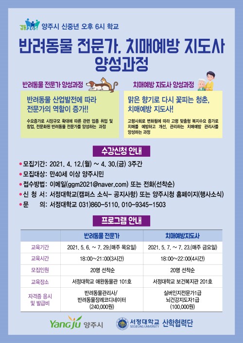 ÇÁ·Î±×·¥ ÀÏÁ¤ µî ±âŸ ÀÚ¼¼ÇÑ »çÇ×Àº ¼Á¤´ëÇб³ ȨÆäÀÌÁö(www.seojeong.ac.kr)¿Í ¾çÁÖ½Ãû ȨÆäÀÌÁö(www.yangju.go.kr)¿¡¼ È®ÀÎÇÒ ¼ö ÀÖ´Ù.