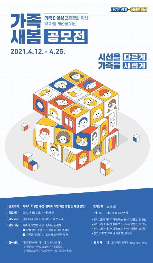 µµ´Â ¿À´Â 25ÀϱîÁö ‘°æ±âµµÀÇ ¼Ò¸® ȨÆäÀÌÁö(https://vog.gg.go.kr)’ ³» ÅëÇÕ°ø¸ð ¸Þ´º¸¦ ÅëÇØ °¡Á·ÀÇ ´Ù¾çÇÑ ±¸¼º °ü·Ã ¡ãÂ÷º°¹ÞÀº °æÇè ¶Ç´Â Â÷º°À» ±Øº¹ÇÑ °æÇè ¡ãÂ÷º°À» °³¼±ÇÒ ¼ö ÀÖ´Â Á¦µµ·Á¤Ã¥ Á¦¾È µî 2°³ ºÐ¾ß¸¦ Á¦¾È¹Þ´Â´Ù.