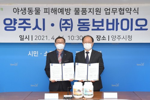 ¾çÁÖ½Ã(½ÃÀå À̼ºÈ£)´Â 14ÀÏ ½Ãû »óȲ½Ç¿¡¼ ¢ßµ¿º¸¹ÙÀÌ¿À(´ëÇ¥ À̱â¿ë)¿Í ¾ß»ýµ¿¹°¿¡ ÀÇÇÑ ÇÇÇØ¿¹¹æÀ» À§ÇÑ ¹°Ç°Áö¿ø ¾÷¹«Çù¾àÀ» ü°áÇß´Ù.