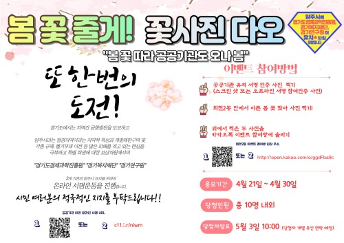 Âü¿©¹æ¹ýÀº ȸõ2µ¿ īī¿ÀÅå ä³Î¿¡ °ü³»¿¡ ÀÖ´Â º½ ²É »çÁø°ú °ø°ø±â°ü 3Â÷ ÀÌÀü ¼¸í ÀÎÁõ »çÁøÀ» ¿Ã¸®¸é Ãß÷À» ÅëÇØ ¸¶À» ÁÖº¯¿¡ ½ÄÀçÇÒ ¼ö ÀÖ´Â ²ÉÀ» Àü´ÞÇϸç īī¿ÀÅå ä³Î ¿ÀǹæÀ» °³¼³ÇØ Âü¿©ÇÑ »çÁøÀ» ÁֹΠ´©±¸³ª º¼ ¼ö ÀÖ°Ô °Ô½ÃÇÒ ¿¹Á¤ÀÌ´Ù.