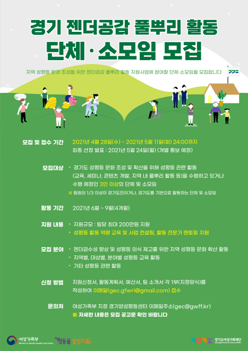 °æ±âµµ¿©¼º°¡Á·Àç´Ü ³» ¿©¼º°¡Á·ºÎ ÁöÁ¤ °æ±â¾ç¼ºÆòµî¼¾ÅͰ¡ µµ³» ¼ºÆòµî ¹®ÈÈ®»êÀ» À§ÇØ 4¿ù 28ÀϺÎÅÍ 5¿ù 11ÀϱîÁö ‘°æ±â Á¨´õ°ø°¨ Ç®»Ñ¸® Ȱµ¿’¿¡ Âü¿©ÇÒ ´Üü·¼Ò¸ðÀÓÀ» ¸ðÁýÇÑ´Ù.
