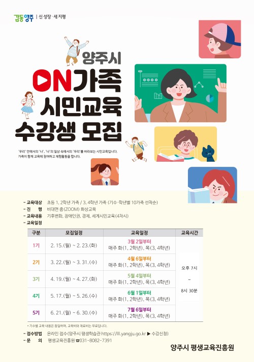 ¾çÁÖ½Ã(½ÃÀå À̼ºÈ£)´Â ¿À´Â 5¿ù 17ÀϺÎÅÍ 5¿ù 26ÀϱîÁö Ãʵî 1~4Çг⠰¡Á·À» ´ë»óÀ¸·Î ¿î¿µÇؿ ‘ON-°¡Á· ½Ã¹Î±³À°’ 4±â ¼ö°»ýÀ» ¸ðÁýÇÑ´Ù.