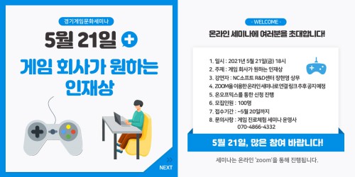 ù ¼¼¹Ì³ª´Â ¿À´Â 21ÀÏ ¿ÀÈÄ 6½Ã¿¡ ‘°ÔÀÓȸ»ç°¡ ¿øÇÏ´Â ÀÎÀç»ó’À̶ó´Â ÁÖÁ¦·Î ÁøÇàµÈ´Ù. NC¼ÒÇÁÆ® R&D¼¾ÅÍ ÀåÇö¿µ ºÎ¼¾ÅÍÀåÀÌ ¿¬»ç·Î ³ª¼ °ÔÀÓ»ç Ãë¾÷À» ²Þ²Ù´Â û¼Ò³âÀ̳ª ÀÚ³àÀÇ °ÔÀÓ Ç÷¹À̸¦ Áø·Î¿Í ¿¬°èÇÏ°í ½ÍÀº º¸È£ÀÚ¿¡°Ô µµ¿òÀÌ µÇ´Â À̾߱⸦ µé·ÁÁÙ ¿¹Á¤ÀÌ´Ù. 1ȸÂ÷ ¼¼¹Ì³ª Âü°¡ ½ÅûÀº ¿À´Â 20ÀϱîÁö ¿Â¿ÀÇÁ¹Í½º(https://onoffmix.com/event/237332)¸¦ ÅëÇØ ÇÒ ¼ö ÀÖ´Ù.