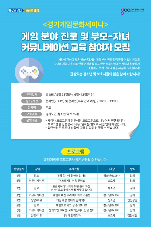 ÀÌÈÄ ´Þ¸¶´Ù ÁøÇàµÇ´Â ¼¼¹Ì³ª´Â ¡ãÇÁ·Î°ÔÀ̸Ӱ¡ µÇ±â À§ÇÑ Áغñ °úÁ¤, °ÔÀÓÀ¸·Î ¸Ô°í»ç´Â ¹ý(ÀÌ»ó Áø·Î ºÐ¾ß) ¡ãÀÚ³à °ÔÀÓ ÀÌ¿ë °ü¸®¹ý, °ÔÀÓ¿¡ ºüÁø ¾ÆÀÌ¿ÍÀÇ ¼ÒÅë¹ý, º¸µå°ÔÀÓÀ» ÅëÇÑ Ã¢ÀÇÀûÀÎ ±³À°¹ý(ÀÌ»ó Ä¿¹Â´ÏÄÉÀÌ¼Ç ºÐ¾ß) ¡ã°ÔÀÓ ¼¼»ó ¹Û¿¡¼ °ü°è ¸Î±â, º¸È£ÀÚ Èú¸µ ±³À°(ÀÌ»ó »ó´ã/Ä¡À¯ ºÐ¾ß) µîÀÇ ÁÖÁ¦·Î ¼ÒÅëÇÒ ¿¹Á¤ÀÌ´Ù.