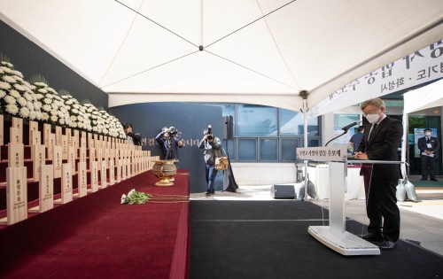ÀÌÀç¸í °æ±âµµÁö»ç°¡ µµ³» ¹«¿¬°í »ç¸ÁÀÚ¸¦ À§ÇÑ ÇÕµ¿Ã߸ðÁ¦¿¡¼ “¿Ü·Ó°Ô Á×Áö ¾Ê´Â ¼¼»ó, ºú ¶§¹®¿¡ Á×Áö ¾Ê°í, ¸Ô°í »ç´Â ¹®Á¦·Î ¼·´°í ¾ï¿ïÇÏÁö ¾ÊÀº ¼¼»ó ¹Ýµå½Ã ¸¸µé¾î ³»°Ú´Ù”¶ó°í ¸»Çß´Ù.