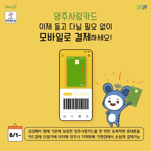 ¾çÁÖ½Ã(½ÃÀå À̼ºÈ£)´Â ¿À´Â 6¿ùºÎÅÍ ÈÞ´ëÀüÈ »ï¼ºÆäÀ̸¦ ÅëÇÑ ‘¾çÁÖ»ç¶û Ä«µå ¸ð¹ÙÀÏ °£Æí°áÁ¦ ¼ºñ½º’¸¦ º»°Ý ½ÃÀÛÇÑ´Ù°í 31ÀÏ ¹àÇû´Ù.