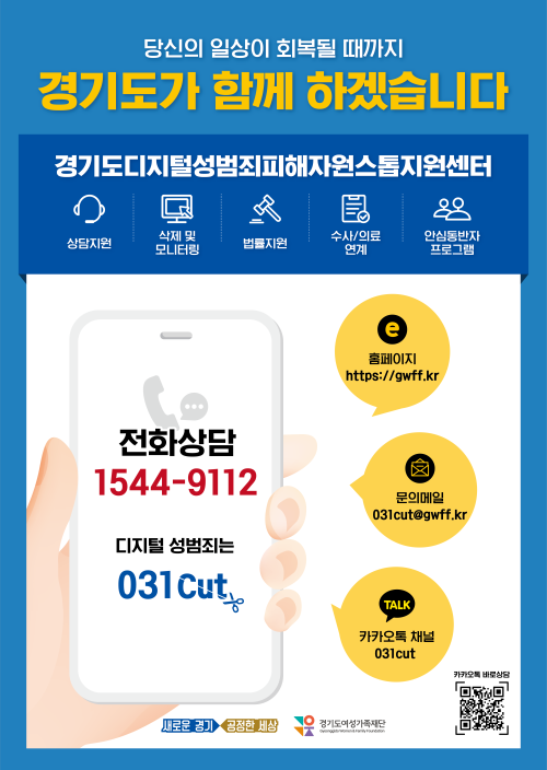 ÇÑÆí µµ´Â Áö³ 2¿ùºÎÅÍ ‘°æ±âµµ µðÁöÅмº¹üÁË ÇÇÇØÀÚ ¿ø½ºÅé Áö¿ø¼¾ÅÍ’¸¦ ¿î¿µ ÁßÀÌ´Ù. ¼¾ÅÍ´Â ÇÇÇØÀÚ »ó´ã, ÇÇÇØ ¿µ»ó »èÁ¦ ¹× ¸ð´ÏÅ͸µ Àü¹®°¡·Î ±¸¼ºµÅ ¹ý·ü Áö¿ø°ú ÀÇ·á Áö¿ø ¿¬°è µî ÇÇÇØÀÚ ¸ÂÃãÇü ¼ºñ½ºµµ Á¦°øÇϰí ÀÖ´Ù. ¶ÇÇÑ °æ±âµµ Ưº°»ç¹ý°æÂû´Ü ¼Ò¼Ó ¼ö»ç°üµµ ÆÄ°ß¹Þ¾Æ û¼Ò³âº¸È£¹ý µî °ü·Ã ¹ý·É À§¹Ý¿¡ ´ëÇÑ ¼ö»çµµ Áö¿øÇÑ´Ù. µðÁöÅÐ ¼º¹üÁË ÇÇÇØ¸¦ º» °æ±âµµ¹ÎÀ̶ó¸é ´©±¸³ª ÀüÈ»ó´ã(1544-9112)°ú īī¿À ä³Î(031cut), À̸ÞÀÏ(031cut@gwff.kr)·Î ¿¬Áß ½Å°íÇÒ ¼ö ÀÖ´Ù.