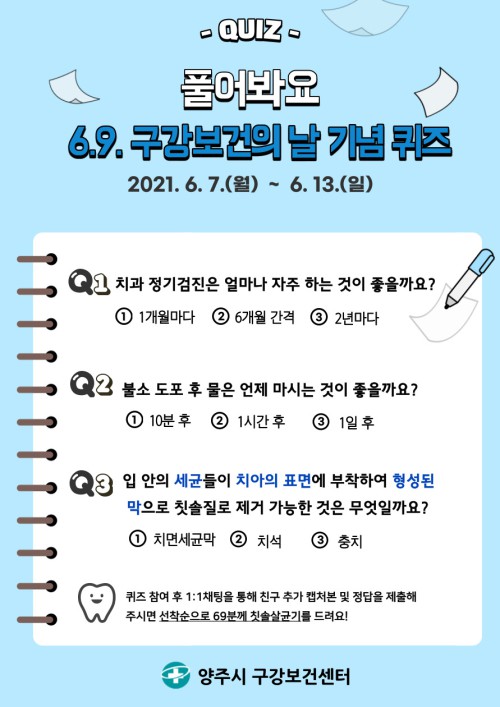 À̹ø À̺¥Æ®´Â ±¸°º¸°Ç ÁÖ°£ÀÎ 7ÀϺÎÅÍ 13ÀϱîÁö ÁøÇàÇÏ¸ç ¾çÁֽùÎÀ̶ó¸é ´©±¸³ª Âü¿©ÇÒ ¼ö ÀÖÀ¸¸ç ¾çÁֽà ±¸°º¸°Ç¼¾ÅÍ Ä«Ä«¿ÀÅå ä³Î Ãß°¡ ÈÄ ÄûÁ Ç®°í Á¤´äÀ» Á¦ÃâÇÏ¸é µÈ´Ù.