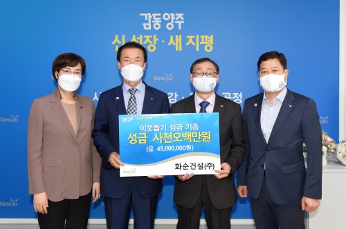 ¾çÁÖ½Ã(½ÃÀå À̼ºÈ£)´Â Áö³ 7ÀÏ È¼ø°Ç¼³(ÁÖ)(´ëÇ¥ ÃÖ»ó±â)¿¡¼ ¾çÁÖ½ÃûÀ» ã¾Æ Äڷγª19·Î ¾î·Á¿ò¿¡ óÇÑ ¼Ò¿ÜÀÌ¿ôµéÀ» À§ÇØ ½á´Þ¶ó¸ç ¼º±Ý 4õ5¹é¸¸¿øÀ» Àü´ÞÇß´Ù.