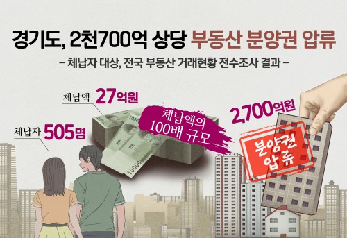 °æ±âµµ°¡ µµ³» ¼¼¿Ü¼öÀÔ ¹× Áö¹æ¼¼ 50¸¸¿ø ÀÌ»ó ü³³ÀÚ¸¦ ´ë»óÀ¸·Î 2020~2021³â 5¿ù Àü±¹ ºÎµ¿»ê °Å·¡ÇöȲÀ» Àü¼öÁ¶»çÇÑ °á°ú, 505¸íÀÌ º¸À¯ÇÑ ºÐ¾ç±Ç(ÀÔÁÖ±Ç) 570°ÇÀ» È®ÀÎÇØ ¾Ð·ùÇß´Ù. ºÐ¾ç±Ç 570°ÇÀÇ °¡¾×Àº 2,700¾ï¿øÀ¸·Î ÇØ´ç ü³³ÀÚµéÀÌ ³³ºÎÇÏÁö ¾ÊÀº ü³³¾× 27¾ï¿øÀÇ 100¹è¿¡ ´ÞÇß´Ù.