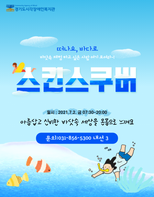 À̹ø Çà»ç´Â Àü¹® °»ç¿Í ½Ã°¢Àå¾ÖÀÎÀÌ 1:1·Î Á¶¸¦ ÀÌ·ç¾î ½ºÄí¹ö Àåºñ Âø¿ë¹ý, È£Èí¹ý ¹× ¼ö½ÅÈ£ µî »çÀü ±³À°À» ÅëÇØ ¾ÈÀüÇÏ°Ô ÁøÇàÇÒ ¼ö ÀÖÀ¸¸ç, ½Ã¿øÇÑ ¹Ù´å¼Ó¿¡¼ ½ºÅ²½ºÄí¹ö üÇè°ú ´õºÒ¾î ÇØ¾ç »ýÅÂ°è º¸Àü Ȱµ¿¿¡ Âü¿©ÇÔÀ¸·Î½á ȯ°æ º¸È£¿¡µµ À̹ÙÁöÇÒ ¼ö ÀÖ´Ù.