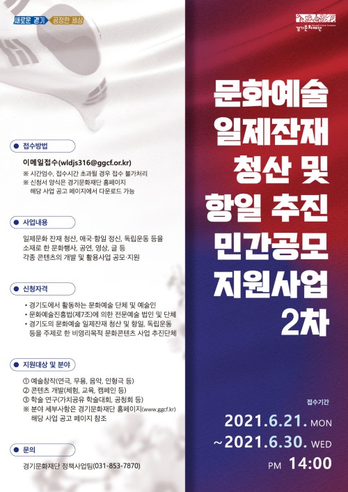 2Â÷ °ø¸ð ½Åû¼ Á¢¼ö´Â 6¿ù 21ÀϺÎÅÍ 6¿ù 30ÀϱîÁö À̸ÞÀÏ Á¢¼ö·Î¸¸ ÁøÇàµÇ¸ç, ½ÉÀÇ ÀÏÁ¤°ú ¼±Á¤ °á°ú ¹ßÇ¥´Â ÃßÈÄ º°µµ °øÁö¸¦ ÅëÇØ ¾È³»µÉ ¿¹Á¤ÀÌ´Ù. ÀÚ¼¼ÇÑ »çÇ× ¹× ½Åû¼ ¾ç½ÄÀº °æ±â¹®ÈÀç´Ü ȨÆäÀÌÁö(www.ggcf.kr)¿¡¼ È®ÀÎÇÒ ¼ö ÀÖ´Ù.