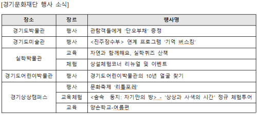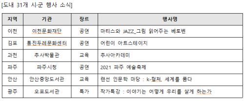 ¼Ò°³µÈ ³»¿ë ¿Ü¿¡ °æ±âµµ ¹®ÈÀÇ ³¯¿¡´Â °æ±âµµ¿Í 31°³ ½Ã±ºÀÌ ÇÔ²²ÇÑ ´Ù¾çÇÑ ¹®È¿¹¼ú »ç¾÷ÀÌ ÁøÇàµÈ´Ù. °úõ Ãß»ç¹Ú¹°°ü¿¡¼ Ãß»ç ±èÁ¤Èñ ¼±»ýÀÇ Çй®°ú ¿¹¼úÀ» Á¾ÇÕÀûÀ¸·Î »ìÆìº¼ ¼ö ÀÖ´Â ¼ºÀÎ ´ëÁß °Á ‘Ãß»ç¾ÆÄ«µ¥¹Ì’°¡ ÀÖ°í, ÆÄÁֽÿ¡¼ ÆÄÁÖ ´ëÇ¥ °ü±¤¸í¼Ò¿¡¼ Ç»Àü±¹¾Ç, ºñº¸ÀÌ, ÀüÅë ¾×¼Ç ¿¬Èñ±Ø µî ¼öÁØ ³ôÀº ÄÜÅÙÃ÷¸¦ ¼±º¸ÀÌ´Â ‘2021 ÆÄÁÖ ¿¹¼úÃàÁ¦’°¡ ¿¸°´Ù. ¾È»ê½ÃÁß¾Óµµ¼°ü¿¡¼ BTSºÎÅÍ ¹Ì³ª¸®±îÁö ¼¼°è°¡ ÀÎÁ¤ÇÑ Çѱ¹ ´ëÁß¹®ÈÀÇ Èû°ú ¼º°ø ºñ°á¿¡ ´ëÇÑ ÁÖÁ¦·Î ¼¼Á¾´ëÇб³ Ãʺù±³¼ö ÀÌÁö¿µÀÌ ÁøÇàÇÏ´Â ‘·£¼± Àι®ÇÐ ¸¶´ç k-ÄÃó, ¼¼°è¸¦ ǰ´Ù’ °¿¬ÀÌ ÀÖ°í, ±¤ÁÖ ¿ÀÆ÷µµ¼°ü¿¡¼ µ¿ÈÀÛ°¡ ·ç¸®°¡ »ì¾Æ³»´Â °Í¿¡ ´ëÇÑ °í¹Î°ú, À̾߱⸦ ÅëÇØ ±× °í¹ÎÀ» Ç®¾î¿Ô´ø ³»¿ëÀ¸·Î ‘ÀÛ°¡ Ư° : À̾߱â´Â ¾î¶»°Ô ¿ì¸®¸¦ »ì°Ô Çϴ°¡’¸¦ ÁøÇàÇÑ´Ù.