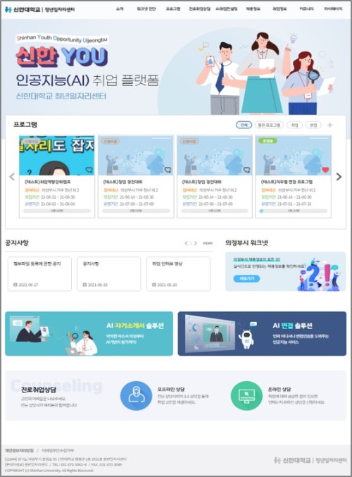 ƯÈ÷ ‘½ÅÇÑYOU’´Â ÃÖ±Ù º¯ÈÇϴ ä¿ë Æ®·»µå¿¡ ¸ÂÃç AI¸éÁ¢/ÀÚ¼Ò¼¸¦ Ȱ¿ëÇÒ ¼ö ÀÖ´Â ¼ºñ½º¸¦ Á¦°øÇÑ´Ù. ÀÌ´Â ½ÅÇÑYOU ȨÆäÀÌÁö(www.shyou.co.kr)¿¡¼ ȸ¿ø°¡ÀÔ ÈÄ ¹«Á¦ÇÑ Á¦°ø¹ÞÀ» ¼ö ÀÖ´Ù. ´õ¿íÀÌ Ã»³âµéÀÇ ´«³ôÀÌ¿¡ ¸ÂÃç PC, ¸ð¹ÙÀÏ¿¡¼ »ç¿ëÀÌ Æí¸®ÇÑ ¹ÝÀÀÇü À¥ ±¸¼ºÀ¸·Î ÀÌ·ç¾îÁ® »ó½ÃÀû Á¢±Ù¼ºÀÌ ¿ëÀÌÇØ ¸ð¹ÙÀÏ È¯°æ¿¡ Àͼ÷ÇÑ Ã»³âµéÀÇ ÀÌ¿ë ÆíÀǸ¦ ³ô¿´´Ù.