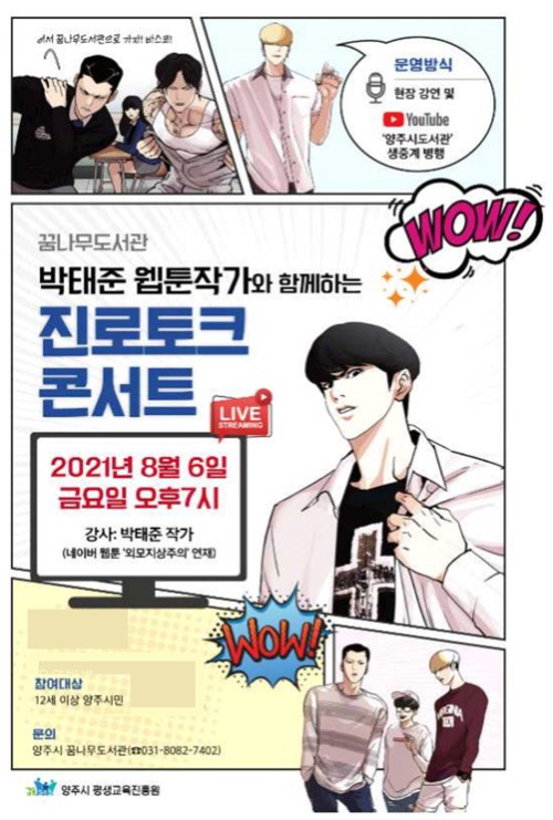 ¾çÁÖ½Ã(½ÃÀå À̼ºÈ£)´Â ¿À´Â 8¿ù 6ÀÏ ¿ÀÈÄ 7½Ã ²Þ³ª¹«µµ¼°ü ¼Ò¸®¹æ¿¡¼ À¯¸í À¥Å÷ÀÛ°¡·Î Ȱµ¿ ÁßÀÎ ¹ÚÅÂÁØ ÀÛ°¡¿Í ÇÔ²² ‘Áø·Î ÅäÅ©ÄܼƮ’¸¦ °³ÃÖÇÑ´Ù.