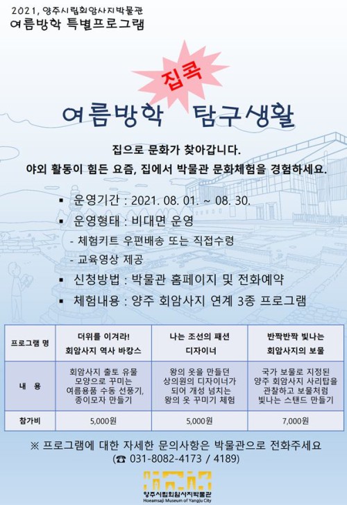 ‘¿©¸§¹æÇÐ ÁýÄÛ Å½±¸»ýȰ’Àº ȸ¾Ï»çÁö ÃâÅäÀ¯¹° ¸ð¾çÀ¸·Î ¼öµ¿¼±Ç³±â¿Í Á¾À̸ðÀÚ ¸¸µé¸ç À¯¹°ÀÇ ¸ð¾ç°ú Àǹ̸¦ ¾Ë¾Æº¸´Â ‘´õÀ§¸¦ À̰ܶó! ȸ¾Ï»çÁö ¿ª»ç ¹ÙIJ½º’, Ƽ¼ÅÃ÷¿¡ ±×·ÁÁø ¿ëÀÇ ¸ð½ÀÀ» ÆÐºê¸¯ ¸¶Ä«·Î Ä÷¯¸µÀ» ÇÏ¸ç ¿Õ½ÇÀÇ ÀǺ¹°ú ¹®È¸¦ üÇèÇÒ ¼ö ÀÖ´Â ‘³ª´Â Á¶¼±ÀÇ ÆÐ¼Ç µðÀÚÀ̳ʒ, ±¹°¡ÁöÁ¤º¸¹°ÀΠȸ¾Ï»çÁö »ç¸®Å¾¿¡ ´ëÇØ ¾Ë¾Æº¸°í ÇÑÁöÁ¶¸í ½ºÅٵ带 ¸¸µå´Â üÇèÀ» ÇÒ ¼ö ÀÖ´Â ‘¹Ý¦¹Ý¦ ºû³ª´Â ȸ¾Ï»çÁöÀÇ º¸¹°’ µî ÃÑ 3°³ÀÇ ÇÁ·Î±×·¥À¸·Î ±¸¼ºµÇ¾î ÀÖ´Ù.