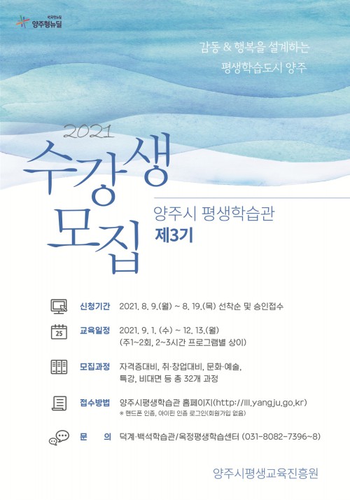 ¾çÁÖ½Ã(½ÃÀå À̼ºÈ£)´Â 9ÀϺÎÅÍ 19ÀϱîÁö Æò»ýÇнÀ°ü Á¦3±â ÇÁ·Î±×·¥ ¼ö°»ýÀ» ¸ðÁýÇÑ´Ù.