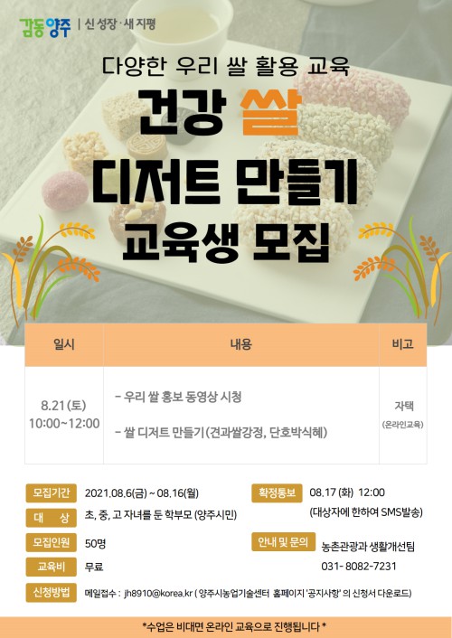 ¾çÁÖ½Ã(½ÃÀå À̼ºÈ£)´Â ¿À´Â 16ÀϱîÁö ´Ù¾çÇÑ °¡°øÇ°À¸·Î Ȱ¿ë °¡´ÉÇÑ ¿ì¸®½ÒÀÇ ¼Òºñ ±â¹ÝÀ» Á¶¼ºÇϱâ À§ÇØ °Ç° ½Ò µðÀúÆ® ¸¸µé±â ±³À° ¼ö°»ýÀ» ¸ðÁýÇÑ´Ù.