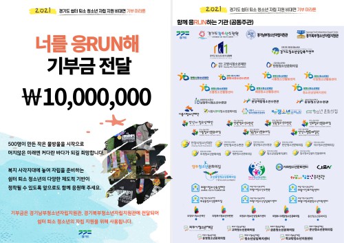°æ±âµµÃ»¼Ò³â¼ö·Ã¿øÀº µµ³» ½°ÅÍ Åð¼Ò û¼Ò³âÀ» À§ÇÑ ºñ´ë¸é ±âºÎ ¸¶¶óÅæ ‘³Ê¸¦ ÀÀ·±(RUN)ÇØ’¸¦ ¿°í, Âü°¡ºñ·Î ¸¶·ÃÇÑ ±âºÎ±Ý 1,000¸¸¿ø Àü¾×À» °æ±â³²·ºÏºÎû¼Ò³âÀÚ¸³Áö¿ø°ü¿¡ Àü´ÞÇß´Ù°í 9ÀÏ ¹àÇû´Ù.