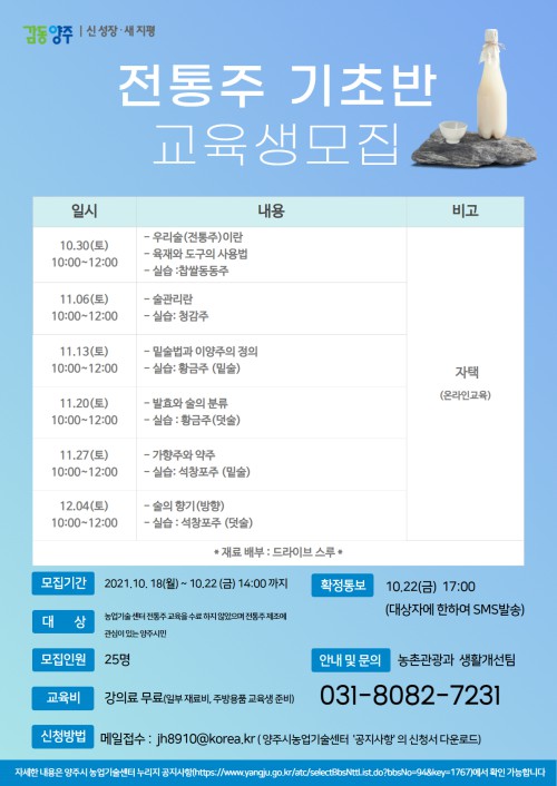 ¾çÁֽà ³ó¾÷±â¼ú¼¾ÅÍ¿¡¼ ÀüÅëÁÖ ±³À°À» ¼ö·áÇÏÁö ¾ÊÀº ¾çÁֽùÎÀ̶ó¸é ´©±¸³ª Âü¿©ÇÒ ¼ö ÀÖÀ¸¸ç ÃÑ 25¸íÀ» ¼±Âø¼øÀ¸·Î ¸ðÁýÇÑ´Ù.