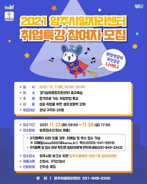 Á¢¼ö±â°£Àº 11¿ù 23ÀÏ(È)ºÎÅÍ 26ÀÏ(±Ý)±îÁöÀ̸ç, ¾çÁÖ½Ãû º¸°Ç¼Ò µÚÆí ¾çÁÖ°í¿ëº¹Áö⁺¼¾ÅÍ 1Ãþ ¾çÁÖ½ÃÀÏÀÚ¸®¼¾ÅÍ(031-849-2342)¸¦ ¹æ¹®ÇØ Á¢¼öÇÏ¸é µÈ´Ù. ´Ü, ±¸Á÷µî·ÏÀÌ µÇ¾î ÀÖ´Â °æ¿ì¿¡´Â À̸ÞÀÏ(miso0601@korea.kr) ¶Ç´Â ÆÑ½º(0505-041-0919)¸¦ ÅëÇØ¼µµ Á¢¼öÇÒ ¼ö ÀÖ´Ù.