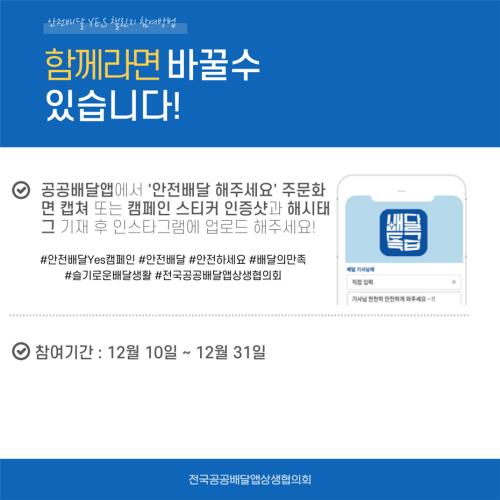 À̹ø SNS 縰Áö Ä·ÆäÀÎÀº °ø°ø¹è´Þ¾Û ÁÖ¹® ȸ鿡¼ ‘¾ÈÀü¹è´Þ ÇØÁÖ¼¼¿ä’ ¿äû »çÇ×ÀÌ º¸À̵µ·Ï ĸÃÄÇÑ µÚ SNS(ÀνºÅ¸±×·¥)¿¡ ƯÁ¤ ÇØ½ÃÅÂ±×¿Í ÇÔ²² ¾÷·ÎµåÇØ °£´ÜÇÏ°Ô Âü¿©ÇÒ ¼ö ÀÖ´Ù. ´õºÒ¾î ¾ÈÀü¹è´Þ Ä·ÆäÀÎ ½ºÆ¼Ä¿¸¦ ÃÔ¿µÇÑ »çÁøÀ¸·Îµµ µ¿ÀÏÇÏ°Ô À̺¥Æ®¿¡ Âü¿©ÇÒ ¼ö ÀÖ´Ù.