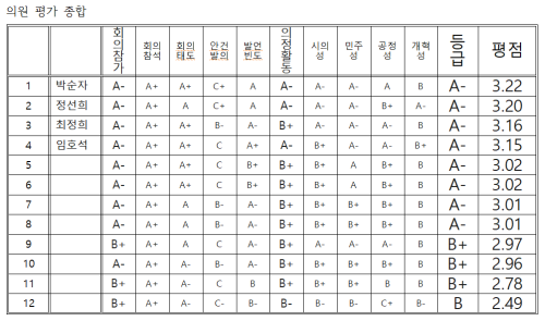 ÀÇÁ¤ºÎ½Ã¹Î»çȸ¿¬´ëȸÀÇ´Â “¸ð´ÏÅ͸µ °á°ú ¹Ú¼øÀÚ, Á¤¼±Èñ, ÃÖÁ¤Èñ, ÀÓÈ£¼® ÀÇ¿øÀÌ 3.15 ÀÌ»ó ÆòÁ¡(4.0 ¸¸Á¡ ±âÁØ)À¸·Î 90Á¡¿¡ °¡±î¿î ÁÁÀº ¼ºÀûÀ» ¹Þ¾Ò´Ù. ÀÌ¿Í ÇÔ²² À̵é 4¸íÀ» Æ÷ÇÔÇÑ 8¸íÀÌ 3.01 ÀÌ»óÀ¸·Î A-¸¦ ȹµæÇÏ¿© ÀÇÁ¤È°µ¿¿¡ ±àÁ¤ÀûÀÎ Æò°¡¸¦ ÇÏ°Ô Çß´Ù”¸ç “¹Ý¸é ¸ð ÀÇ¿øÀº 2.49·Î ÃÖÇÏÀ§ ÆòÁ¡(B)À» ¹Þ¾Æ ºÐ¹ßÇØ¾ß ÇÒ ÀÇ¿øÀ¸·Î ²ÅÇû´Ù”°í ºÐ¼®Çß´Ù.