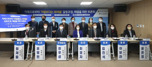 “ÇÐÆøÀ¸·ÎºÎÅÍ ‘ó¹úº¸´Ù´Â ÈÇØ¸¦’ °¥µîÁ¶Á¤, ÇØ°áÀ» À§ÇÑ Åä·Ðȸ”¸¦ ÁÖÁ¦·Î ÁøÇàµÈ ÀÌ ³¯ Åä·Ðȸ¿¡¼´Â °æ±âµµÀÇȸ ±³À°±âȹÀ§¿øÈ¸ ÃÖ°æÀÚ ÀÇ¿ø(´õºÒ¾î¹ÎÁÖ´ç, ÀÇÁ¤ºÎ1)À» ÁÂÀåÀ¸·Î ¼ö¿ø±³À°Áö¿øÃ» ÇлýÁö¿ø¼¾ÅÍ Ãֿ켺 ÀåÇлçÀÇ ÁÖÁ¦¹ßÇ¥¿Í °æ±âµµ±³À°Ã» Çлý»ýȰÀαǰú Çб³Æø·Â´ëÃ¥´ã´ç ¿øÀçÇÊ ÀåÇаü, ÀÇÁ¤ºÎ±³À°Áö¿øÃ» À±¸íÇö ÀåÇлç, °í¾ç¿Ü±¹¾î°íµîÇб³ ±èÁø¼® ±³°¨ ¹× À̺¸¶ó Çкθð, ÀÇÁ¤ºÎ±³À°Áö¿øÃ» îñ Çб³Æø·Â½ÉÀÇÀ§¿øÀÎ À±ÀºÁ¤ À§¿øÀÌ Åä·ÐÀÚ·Î Âü¼®ÇØ È°¹ßÇÑ Åä·ÐÀ» ÆîÃÆ´Ù.
