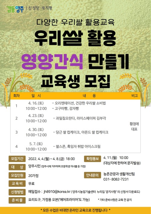 ¾çÁֽóó¾÷±â¼ú¼¾ÅÍ(¼ÒÀå ÀüÃá)´Â ¿À´Â 8ÀϱîÁö ¿ì¸®½Ò Ȱ¿ë ¿µ¾ç°£½Ä ¸¸µé±â ±³À° ¼ö°»ýÀ» ¸ðÁýÇÑ´Ù.