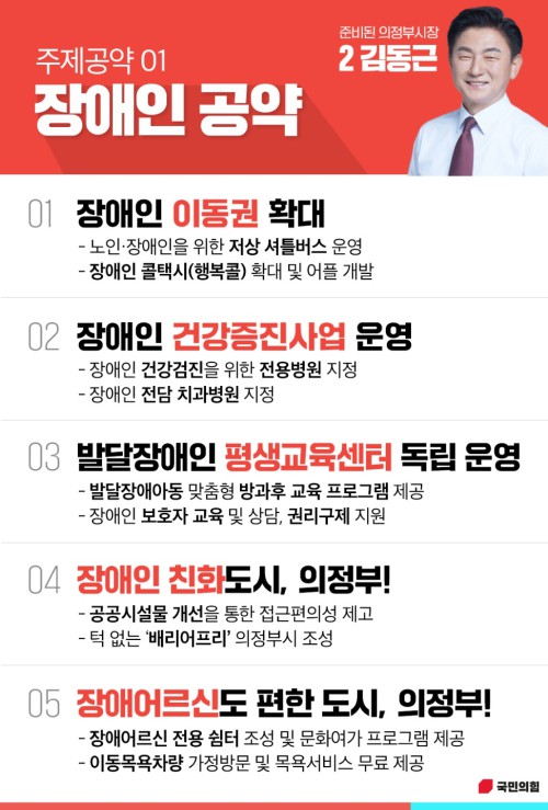±èµ¿±Ù ÀÇÁ¤ºÎ½ÃÀå ¿¹ºñÈĺ¸(ÀÌÇÏ ¿¹ºñÈĺ¸)´Â Á¦42ȸ Àå¾ÖÀÎÀÇ ³¯À» ¸Â¾Æ 'Àå¾ÖÀÎÀÌ ÇູÇÑ µµ½Ã, ÀÇÁ¤ºÎ'¸¦ ¸¸µé°Ú´Ù´Â ºñÀüÀ» ¹àÈ÷¸ç 5´ë ¹æÇ⼺°ú 10°³ÀÇ ¼¼ºÎ°ø¾àÀ» ¹ßÇ¥Çß´Ù.
