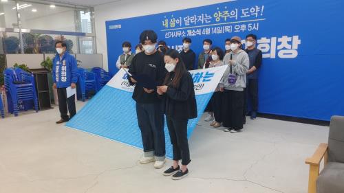 ÀÌ¾î “¿ì¸®°¡ ÀÌÈñâ È常¦ ÁöÁöÇÏ´Â ÀÌÀ¯´Â ±×°¡ °É¾î¿Â ±æÀÌ ¾çÁÖÀÇ ¹ÎÁÖ´ç ¿ª»ç¶ó ÇØµµ °ú¾ðÀÌ ¾Æ´Ï±â ¶§¹®”À̶ó¸ç “¹ÎÁÖ´ç û³âȰµ¿À» ½ÃÀÛÀ¸·Î ÀåÈïÇùÀÇȸÀåÀ» ¸Ã¾Æ ¹ÎÁÖ´çÀÇ ºÒ¸ðÁö¿´´ø ¾çÁÖ¿¡¼ 4¼± Á¤¼ºÈ£ ÀÇ¿ø´Ô°ú ÇÔ²² 20¿©³â ¹ÎÁÖ´çÀÇ ÇÑ ÃàÀ» ´ã´çÇØ¿Â °ÍÀÌ »ç½Ç”À̶ó°í °Á¶Çß´Ù.