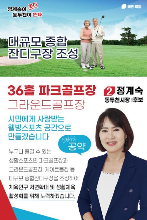 µ¿µÎõ½ÃÀå ¿¹ºñÈĺ¸ Á¤°è¼÷ ½ÃÀÇ¿ø(±¹¹ÎÀÇÈû)Àº, ½ÃÀåÀÌ µÇ¸é ³ëÀÎȸ°üÀ» °Ç¸³Çϰí 36Ȧ ÆÄÅ©°ñÇÁÀå°ú ±×¶ó¿îµå°ñÇÁÀåÀ» °®Ãá Á¾ÇÕÀܵð±¸ÀåÀ» Á¶¼ºÇÏ°Ú´Ù°í ¾à¼ÓÇß´Ù. ÀÌ µÎ °ø¾àÀº ¾î¸£½ÅµéÀ» À§ÇÑ Á¤°è¼÷ ¿¹ºñÈĺ¸ÀÇ ´ëÇ¥ °ø¾àµéÀÌ´Ù.