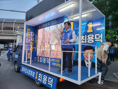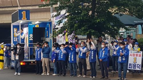 ÃÖ¿ë´ö ´õºÒ¾î¹ÎÁÖ´ç µ¿µÎõ½ÃÀå È帴 5¿ù19ÀÏ ¿ÀÈÄ 6½Ã30ºÐ ÁöÇ࿪ ¾Õ¿¡¼ ½Ã¹ÎµéÀÇ Åð±Ù ½Ã°£¿¡ ¸ÂÃç ÃâÁ¤½ÄÀ» ¿°í “ÇÑ ¹ø ´õ ÃÖ¿ë´ö”À» ¿ÜÄ¡¸ç ÁöÁö¸¦ È£¼ÒÇß´Ù.