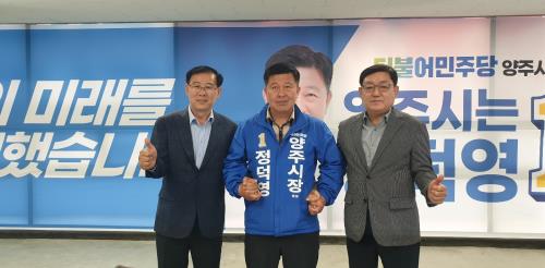 Á¤´ö¿µ ´õºÒ¾î¹ÎÁÖ´ç ¾çÁÖ½ÃÀå Èĺ¸¿Í ÇÔ²² °æ¼±À» Ä¡·ð´ø ¹ÚÀ縸, ÀÌÈñâ °øµ¿¼±´ëÀ§¿øÀåÀº 5¿ù24ÀÏ Á¤´ö¿µ Èĺ¸ ¼±°Å»ç¹«¼Ò¿¡ ¸ð¿© ½Â¸®ÀÇ °¢¿À¸¦ ´ÙÁ³´Ù.