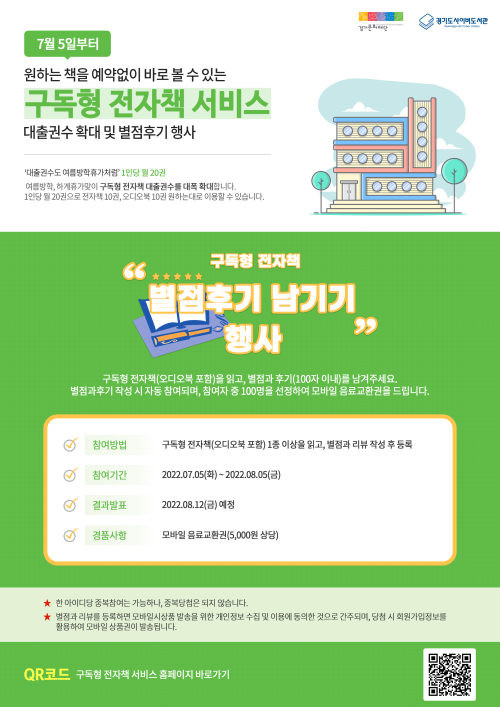 À̹ø ´ëÃ⠱Ǽö °³ÆíÀ» ¸ÂÀÌÇØ µµ´Â ‘±¸µ¶Çü ÀüÀÚÃ¥ ÀÌ¿ë Èıâ ÀÛ¼º ÀÀ¸ð Çà»ç’µµ ÁøÇàÇÑ´Ù. 7¿ù 5ÀϺÎÅÍ 8¿ù 5ÀϱîÁö ±¸µ¶Çü ÀüÀÚÃ¥(¿Àµð¿ÀºÏ Æ÷ÇÔ)À» 1±Ç ÀÌ»ó ÀÐ°í º°Á¡°ú ÀÌ¿ë Èı⸦ ³²±â¸é ÀÚµ¿ ÀÀ¸ðµÇ¸ç, Âü°¡ÀÚ Áß 100¸íÀ» ÃßÃ·ÇØ ¸ð¹ÙÀÏ À½·á ±³È¯±ÇÀ» ÁõÁ¤ÇÑ´Ù.