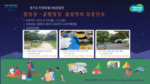 °æ±âµµ Ưº°»ç¹ý°æÂû´ÜÀÌ 8¿ù 29ÀϺÎÅÍ 9¿ù 2ÀϱîÁö ÀÇÁ¤ºÎ½Ã, ¾çÁÖ½Ã, µ¿µÎõ½Ã ¼ÒÀç Ä·ÇÎÀå°ú ±Û·¥ÇÎÀå µî ¾ß¿µÀå 47°÷ÀÇ ºÒ¹ýÇàÀ§¸¦ ÁýÁß ´Ü¼ÓÇÑ´Ù.