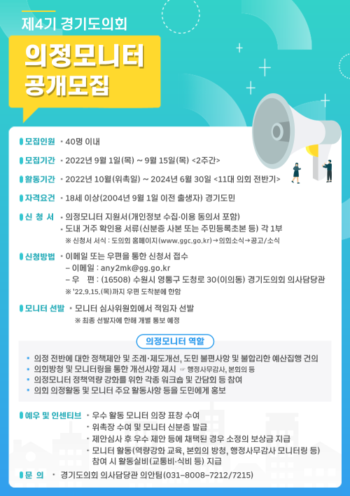 ½Åû¼½ÄÀº °æ±âµµÀÇȸ ȨÆäÀÌÁö(www.ggc.go.kr) ¶Ç´Â µµ³» 31°³ ½Ã±º Áö¿ª»ó´ã¼Ò¿¡¼ ¹ÞÀ» ¼ö ÀÖÀ¸¸ç, ´ã´çÀÚ À̸ÞÀÏ(any2mk@gg.go.kr/031-8008-7215)À̳ª ¿ìÆí(°æ±âµµ ¼ö¿ø½Ã ¿µÅ뱸 µµÃ»·Î 30, °æ±âµµÀÇȸ ÀÇ»ç´ã´ç°ü ÀÇ¾ÈÆÀ)À¸·Î Á¢¼öÇÏ¸é µÈ´Ù.
