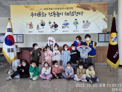¹Ù¸£°Ô»ì±â¿îµ¿ ¾çÁÖ½ÃÇùÀÇȸ(ȸÀå Á¤Àº±â)´Â Áö³ 10¿ù20ÀÏ ¾çÁÖ¹®¿¹È¸°ü¿¡¼ °ü³» 6~7¼¼ ¾î¸°ÀÌ 300¿©¸íÀ» ´ë»óÀ¸·Î ‘ÀØÇôÁ® °¡´Â ¿ì¸®ÀÇ ÀüÅë³îÀÌ’ üÇèÇà»ç¸¦ ½Ç½ÃÇß´Ù.