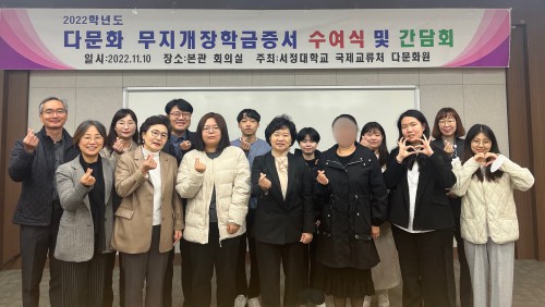 ¼Á¤´ëÇб³(ÃÑÀå ¾ç¿µÈñ)´Â 2022³â 11¿ù 10ÀÏ º»±³ ´ëȸÀǽǿ¡¼ 2022Çг⵵ ´Ù¹®È ¹«Áö°³ ÀåÇÐ±Ý Áõ¼ ¼ö¿©½Ä ¹× °£´ãȸ¸¦ °¡Á³´Ù. ÀÌ ÀÚ¸®¿¡´Â ¾ç¿µÈñ ÃÑÀå°ú ½Å´ö»ó ±¹Á¦±³·ùóÀå, Á¶°æÀÚ ´Ù¹®È¿øÀå µî ´Ù¼öÀÇ ±³¼ö ¹× ÇлýµéÀÌ Âü¿©Çß´Ù. À۳⿡ ÀÌ¾î ¿ÃÇØµµ ¿Ü±¹ÀÎ À¯ÇлýÀÌ ¾Æ´Ñ ´Ù¹®È °¡Á· Çлýµé 10¸í¿¡°Ô ÀåÇÐÁõ¼ ¹× ÀåÇбÝÀÌ ¼ö¿©µÇ¾ú´Ù.